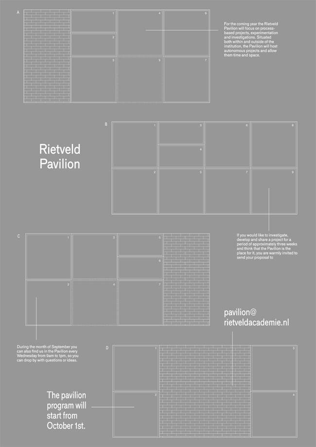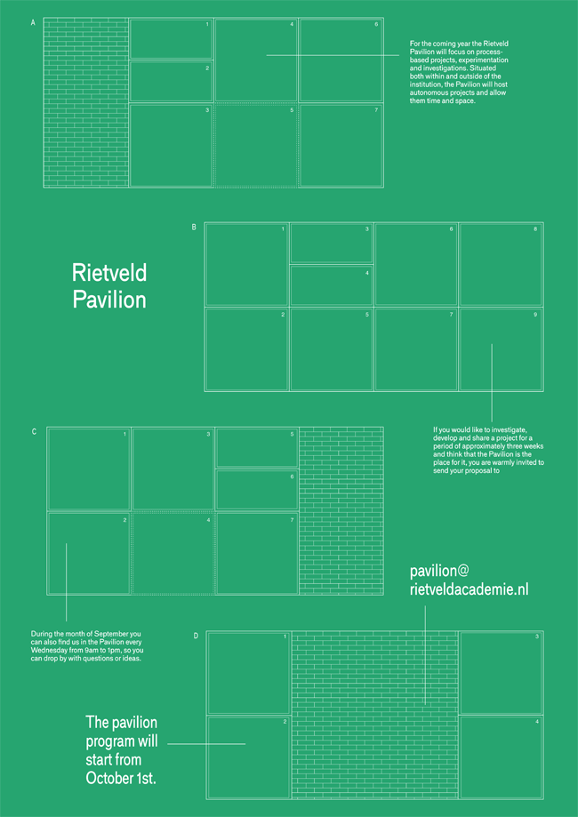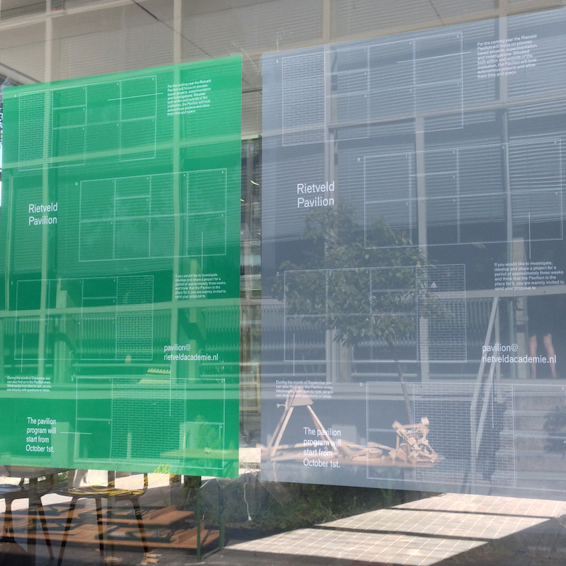 The Rietveld Pavilion is a work space in a glass structure situated in front of the Gerrit Rietveld Academie. It is managed by Stefanie Rau (Critical Studies, Sandberg Instituut) and Marie Larsen (VaV, Gerrit Rietveld Academie). Continuing Kristine Nørgaard Andersen’s work in the Pavilion (2015-2016), Stefanie and Marie are now working on the project as a collaborative investigation of site-specific process-based projects. Their interest revolves around the unimagined results of projects that are given time and space to evolve, change and materialise in an open environment. The already existing conditions of the space have been altered and stretched in order to allow experiments, growth and further reflections. With a focus on sharing thoughts and processes they are looking for new ways of thinking about exhibiting within and outside the institution of the academy. Contact: pavilion@rietveldacademie.nl